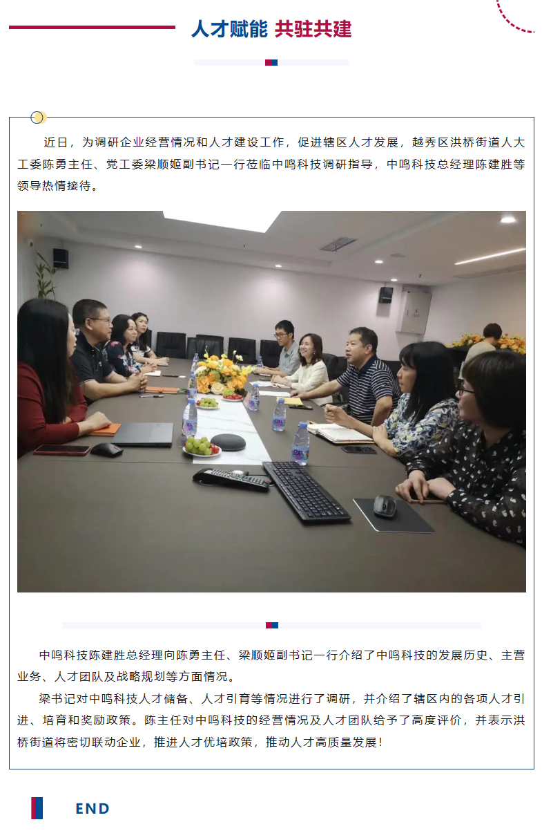 人才賦能,共駐共建——越秀區(qū)洪橋街道人大工委陳勇主任、黨工委梁順姬副書記一行蒞臨中鳴科技調(diào)研指導(dǎo)