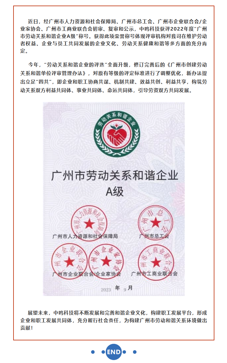 中鳴科技榮獲“廣州市勞動(dòng)關(guān)系和諧企業(yè)”稱(chēng)號(hào)