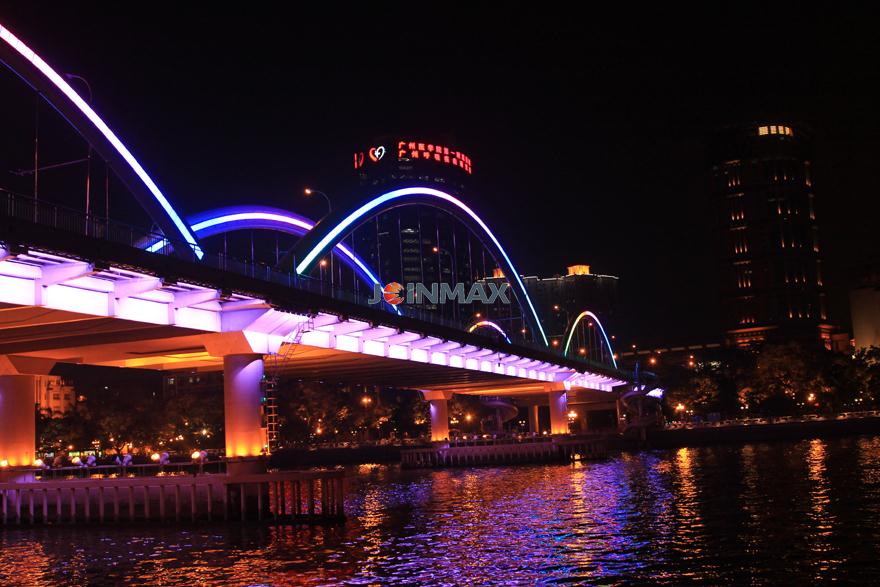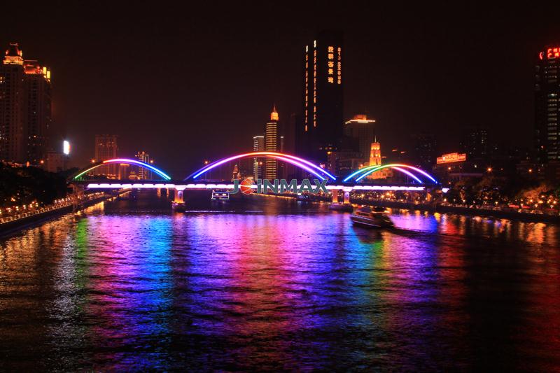 Project description: The Liberation bridge, Jiangwan Bridge, Haiyin Bridge, are located over the Pearl River, Guangzhou. The designing concept is to collocate with appropriate lamp and simple line sketch to accentuate the structural beauty of the bridge , bring visual pleasures for the viewers and make the city landscape of Guangzhou more charming and attractive. Joinmax provides self-developed LED lamp and optical fiber circuit control system with the latest concept and notion to this whole light project and make the extraordinary bridge more splendid.